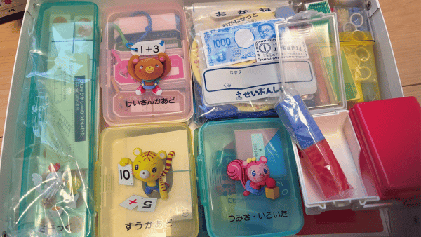 「今日はおはじきだけやろう」、「お金セットと積み木を今日はやろう」と小出しに分けて行うと負担感も軽減されます。また、アイテムごとでなくても、「30分だけやろ」など時間で区切って行うのも良いでしょう。