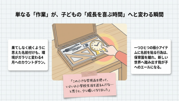 名前を付けた学用品を使って子どもが小学校生活を送るんだと思うと、成長を感じて少し嬉しくもなりました。